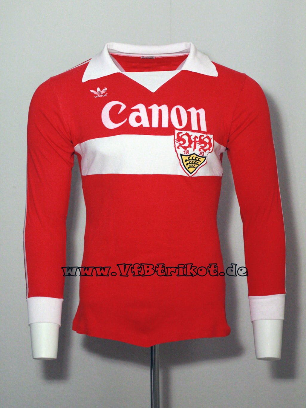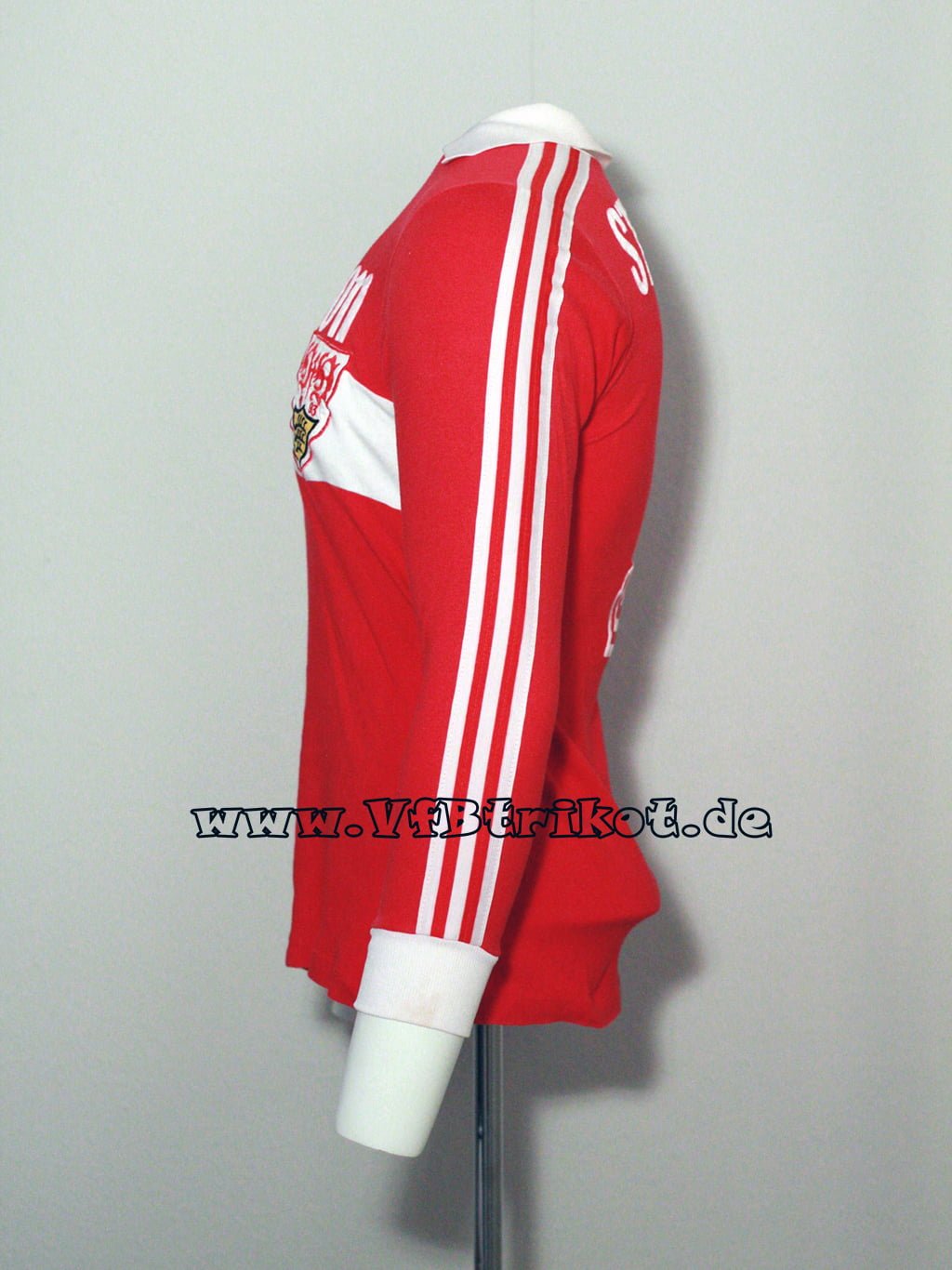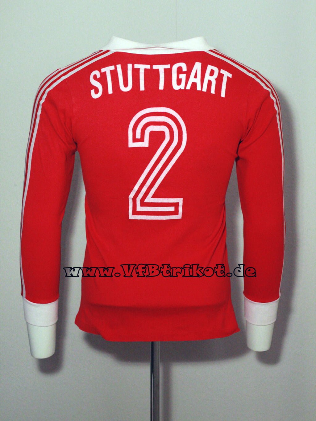1979/80 – Bundesliga – rot – langarm – Canon – Adidas – Ein sehr seltenes Trikot. Die gerade Stuttgart Schriftart wurde meines Wissen nach nur in den letzten paar Auswärtsspielen in der Saison 79/80 getragen, zudem ist das Wappen auf dem Herz und nicht mittig, wie üblich. In der Zeit trug die Nr. 2 hauptsächlich Berd Martin.