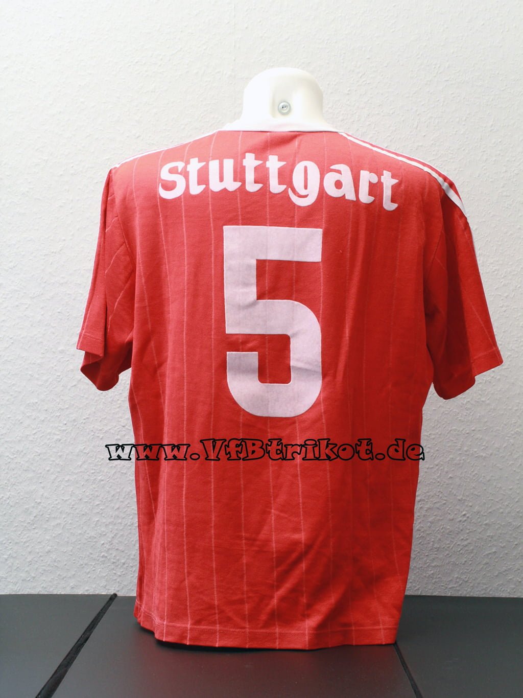 1996/97 – Bundesliga – rot – kurzarm – Fredi Bobic – Bei der ersten Auflage der Spielertrikots waren die Rückennummern und Name analog zum Trikotstoff leicht gelöchert. Ich vermute, dass diese so von Adidas direkt geliefert worden sind.