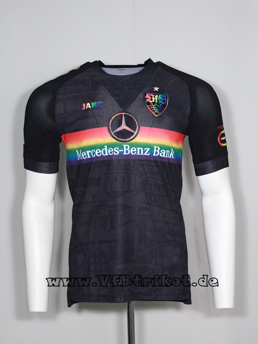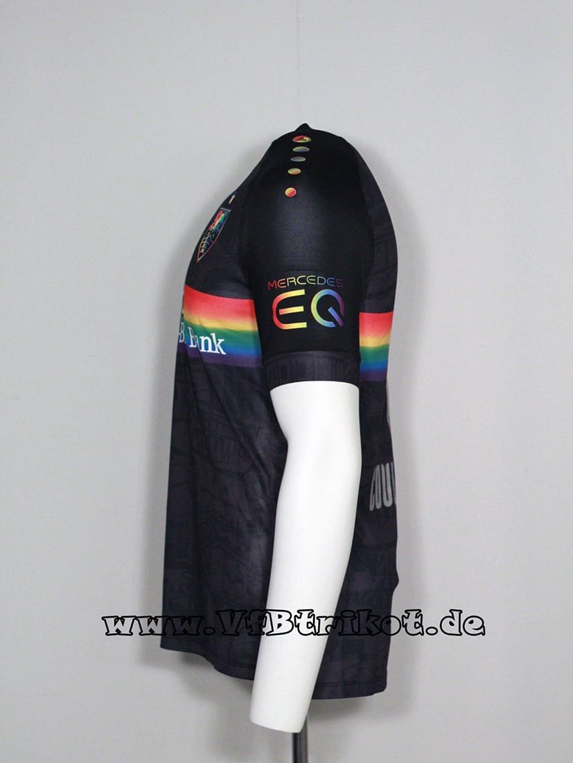 2022/23 – Bundesliga – Vielfalt Sondertrikot – schwarz – kurzarm – Tanguy Coulibaly – VfB-Wolfsburg – Im Rahmen des „Internationalen Wochen gegen Rassismus“ im deutschen Profifußball spiele der VfB mit den Regenbogenfarben im Brustring, Wappen und Ausrüster Jako Logo