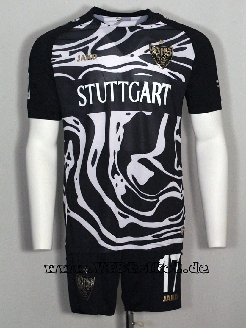 2023/24 – Bundesliga – Tim Bengel Krauttrikot schwarz – kurzarm – Genki Haraguchi – inkl. Hose – VfB – Werder Bremen – Der Künstler Tim Bengel kreirte, unter dem Motto „StuttgART“, aus dem Querschnitt eines Krautkopf dieses Design. Anstelle von Winamax und hep war StuttgART und Werbung für für VfB Stiftung zu sehen.
