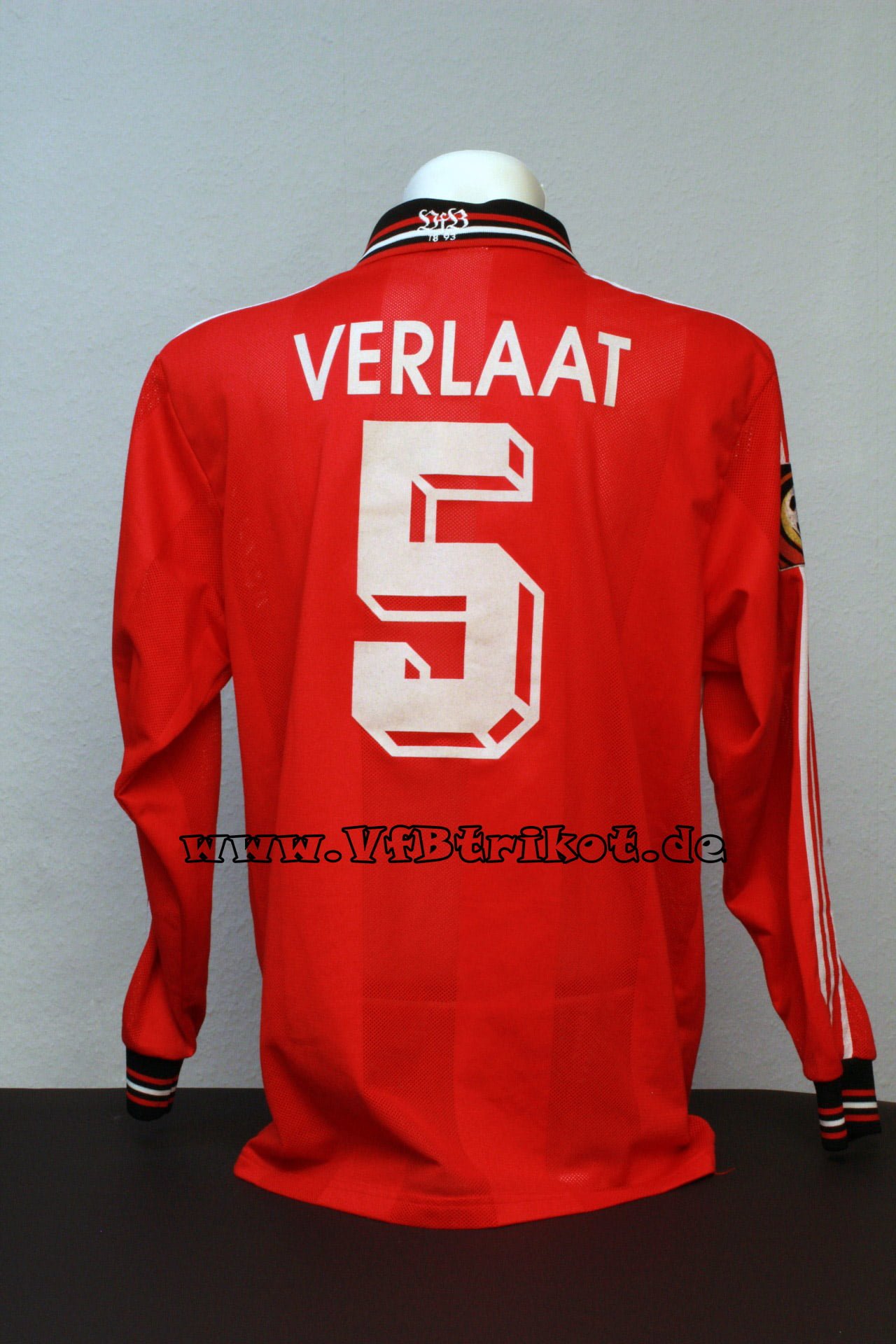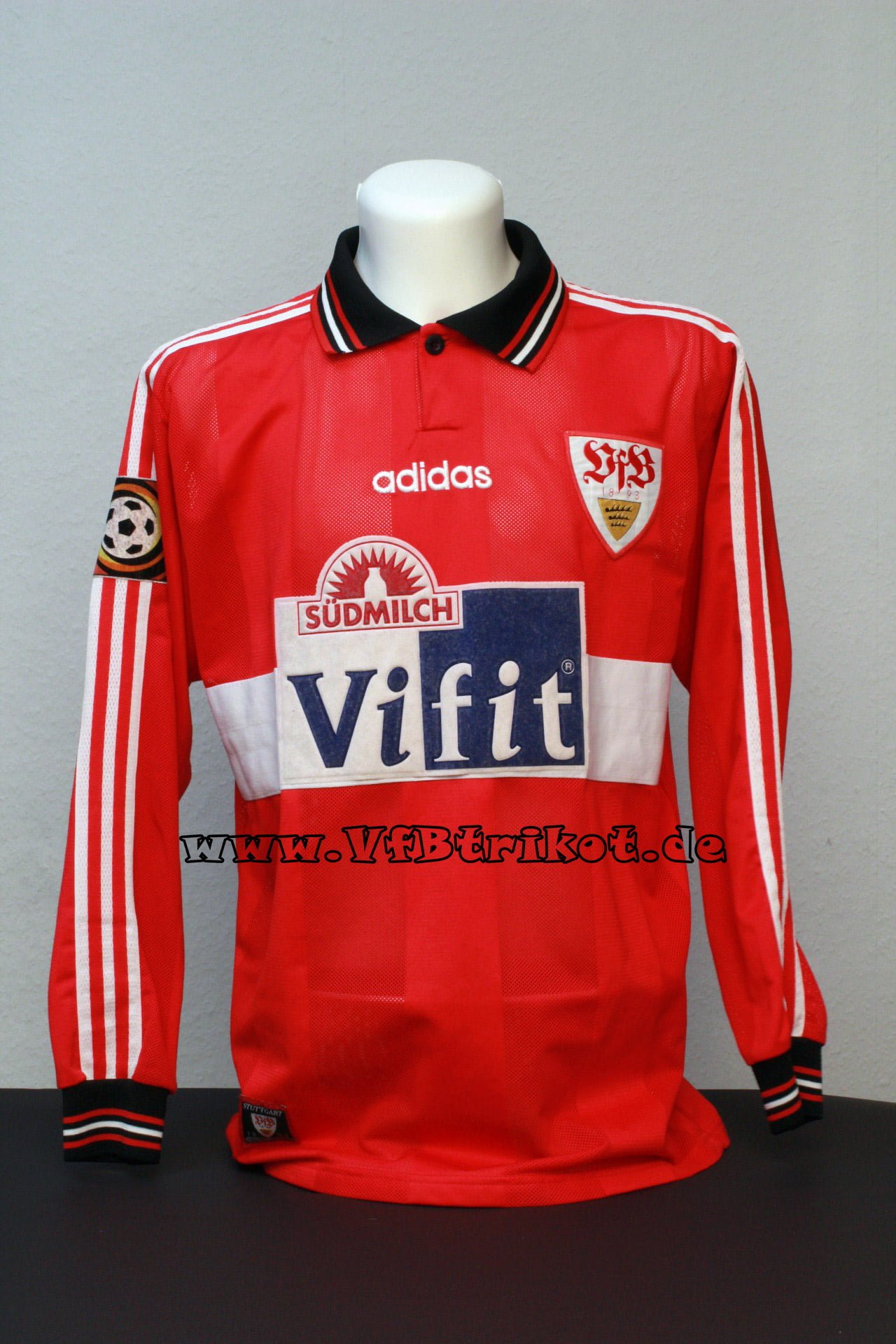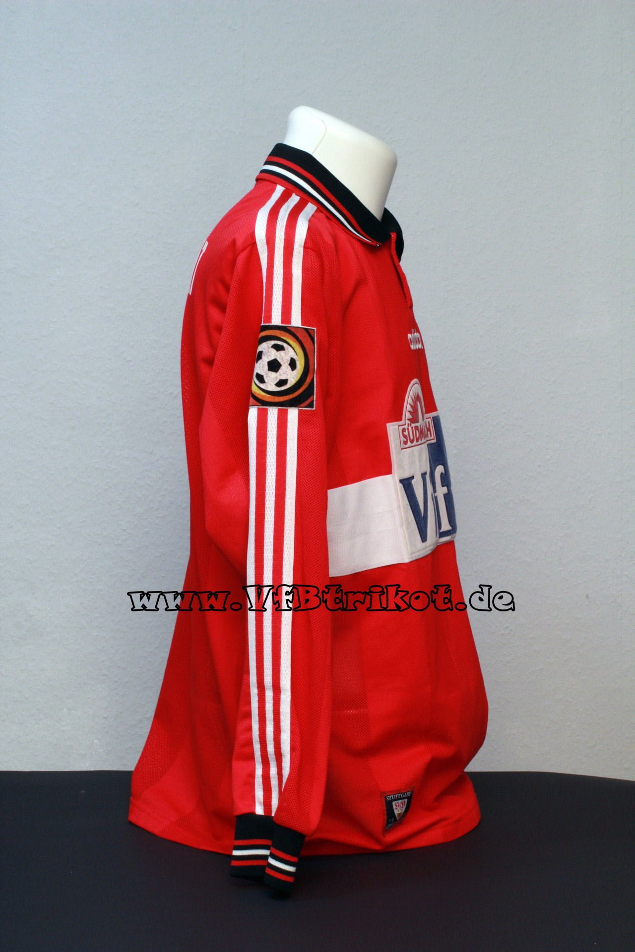 1996/97 – Bundesliga – rot – kurzarm – Fredi Bobic – Bei der ersten Auflage der Spielertrikots waren die Rückennummern und Name analog zum Trikotstoff leicht gelöchert. Ich vermute, dass diese so von Adidas direkt geliefert worden sind.