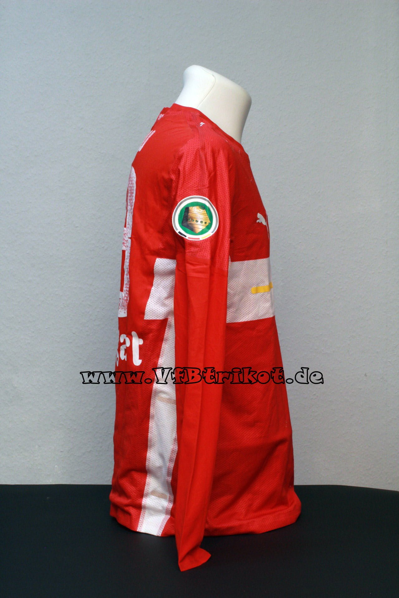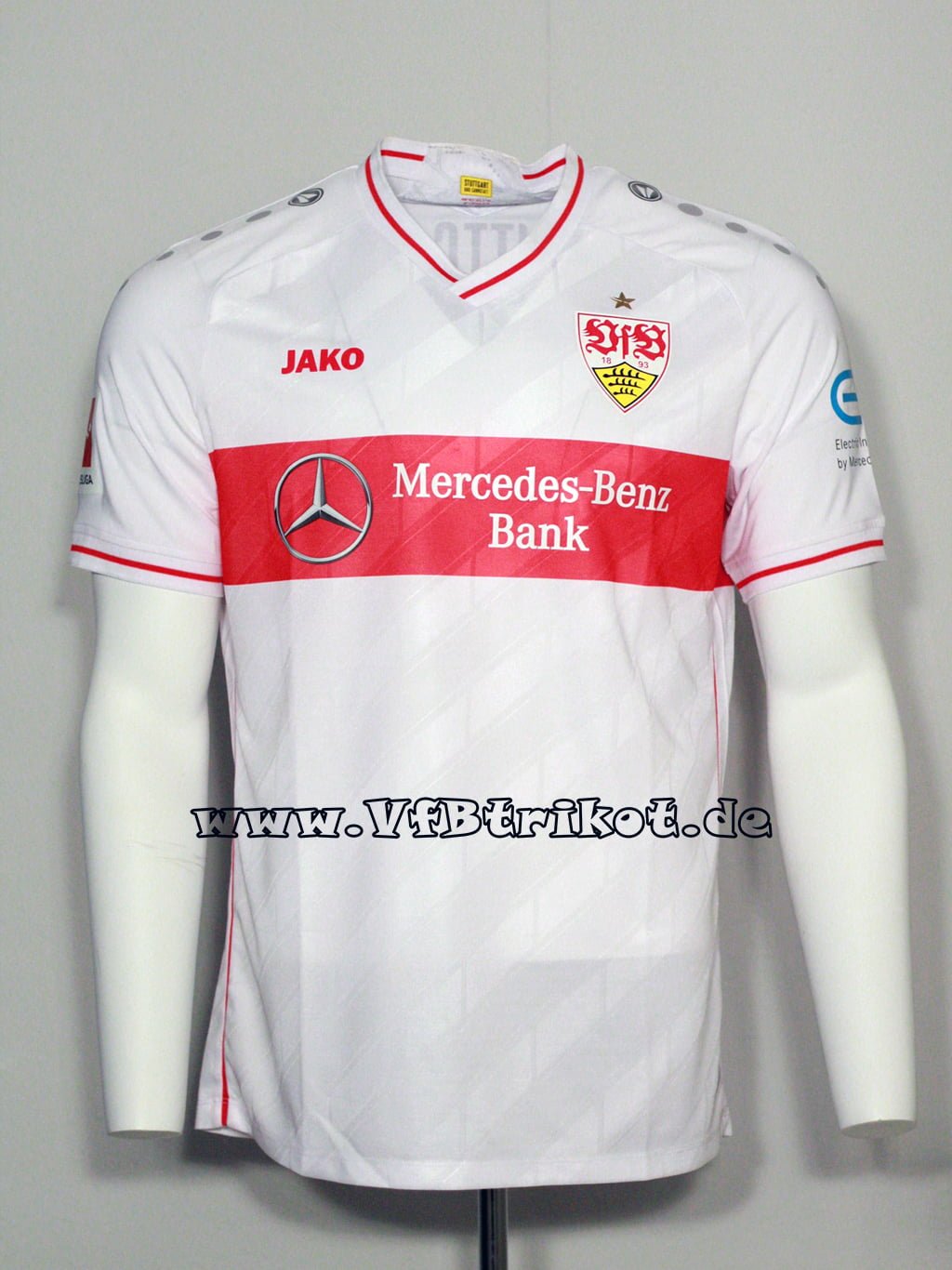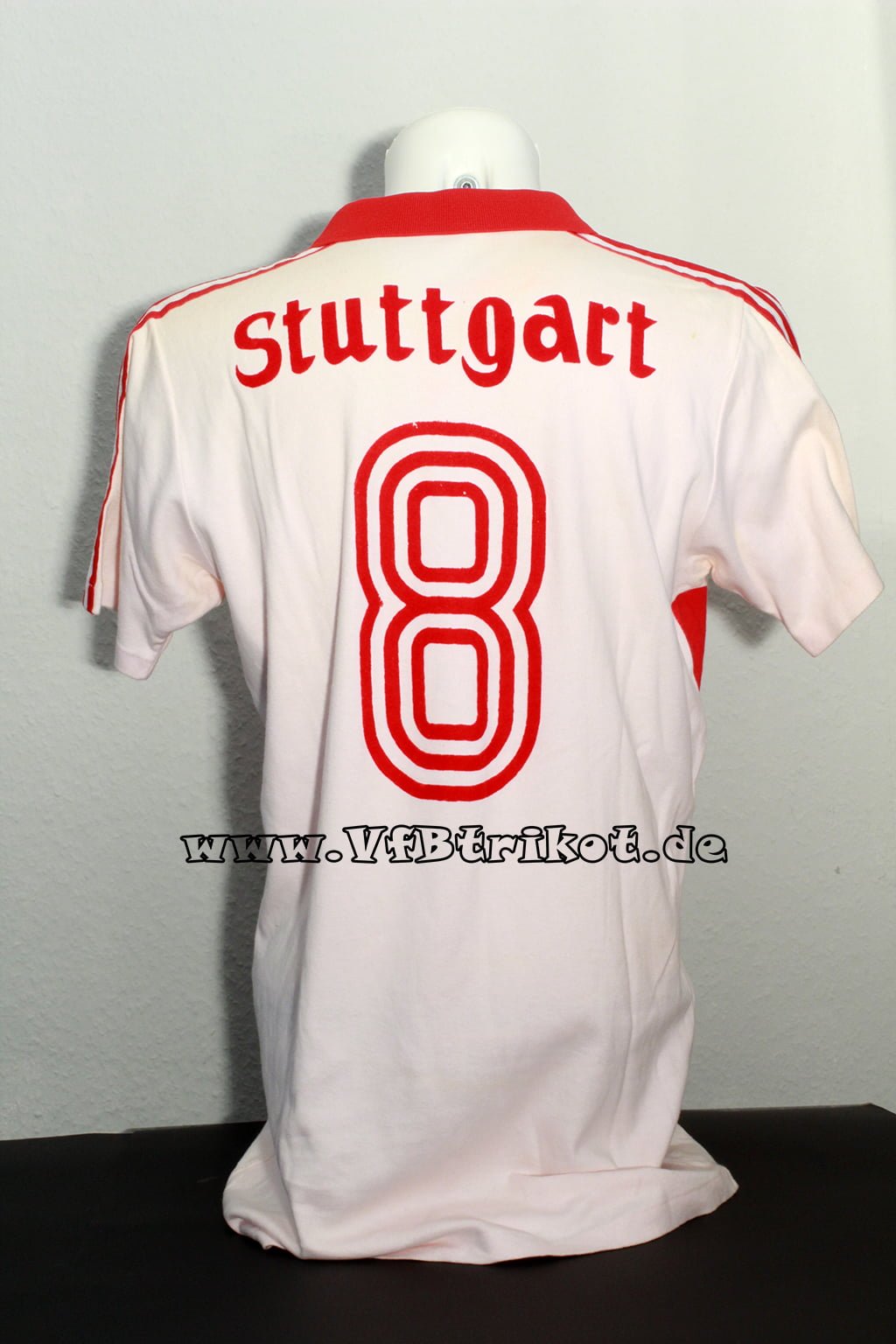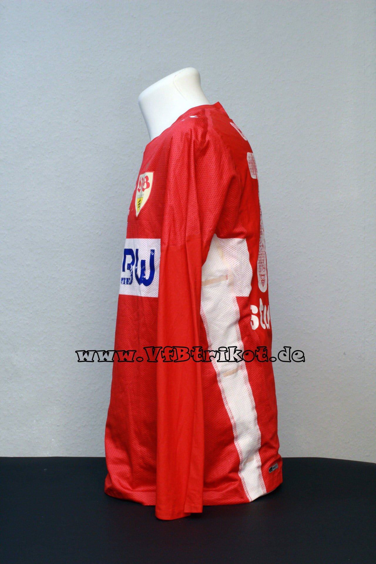 1996/97 – Bundesliga – rot – kurzarm – Fredi Bobic – Bei der ersten Auflage der Spielertrikots waren die Rückennummern und Name analog zum Trikotstoff leicht gelöchert. Ich vermute, dass diese so von Adidas direkt geliefert worden sind.