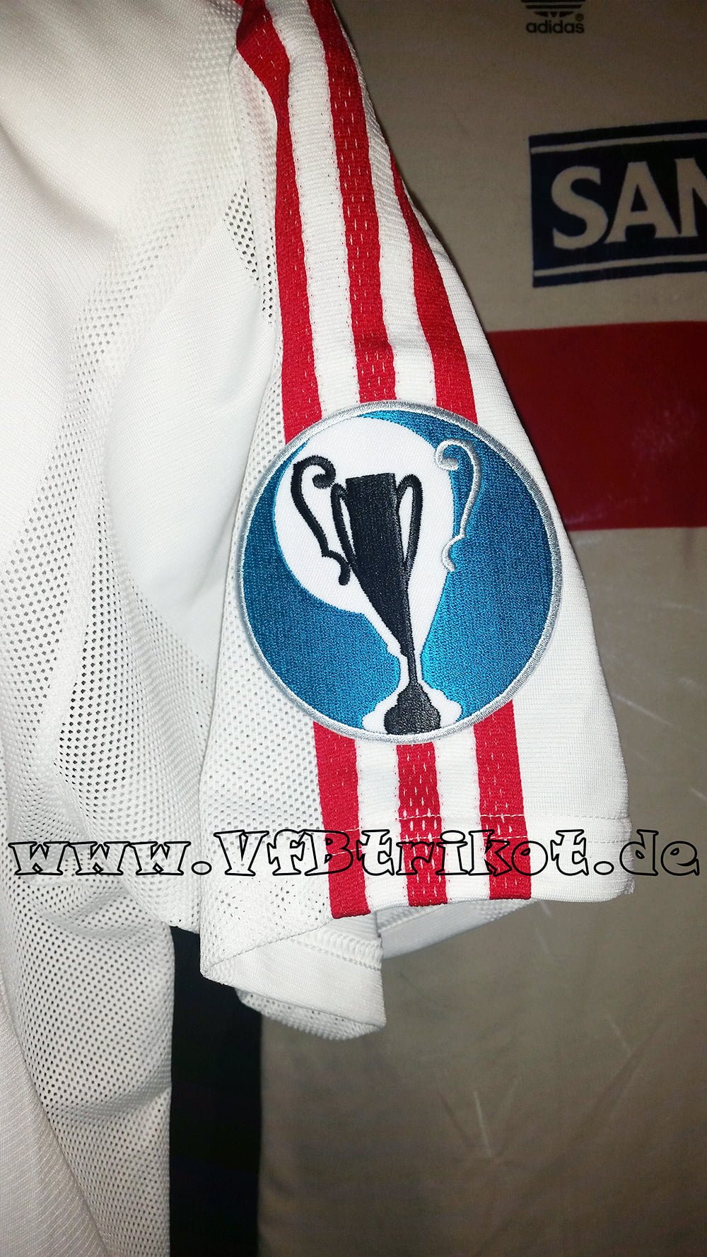1997/98 – Gerhard Poschner – Europapokal der Pokalsieger Finale – weiß – kurzarm – mit diesem Patch wurde ausschließlich im Finale in Stockholm gegen den FC Chelsea gespielt. Außerdem ist sowohl der Schriftzug als auch das Logo vom Sponsor Göttinger Gruppe dünner und kleiner beflockt.