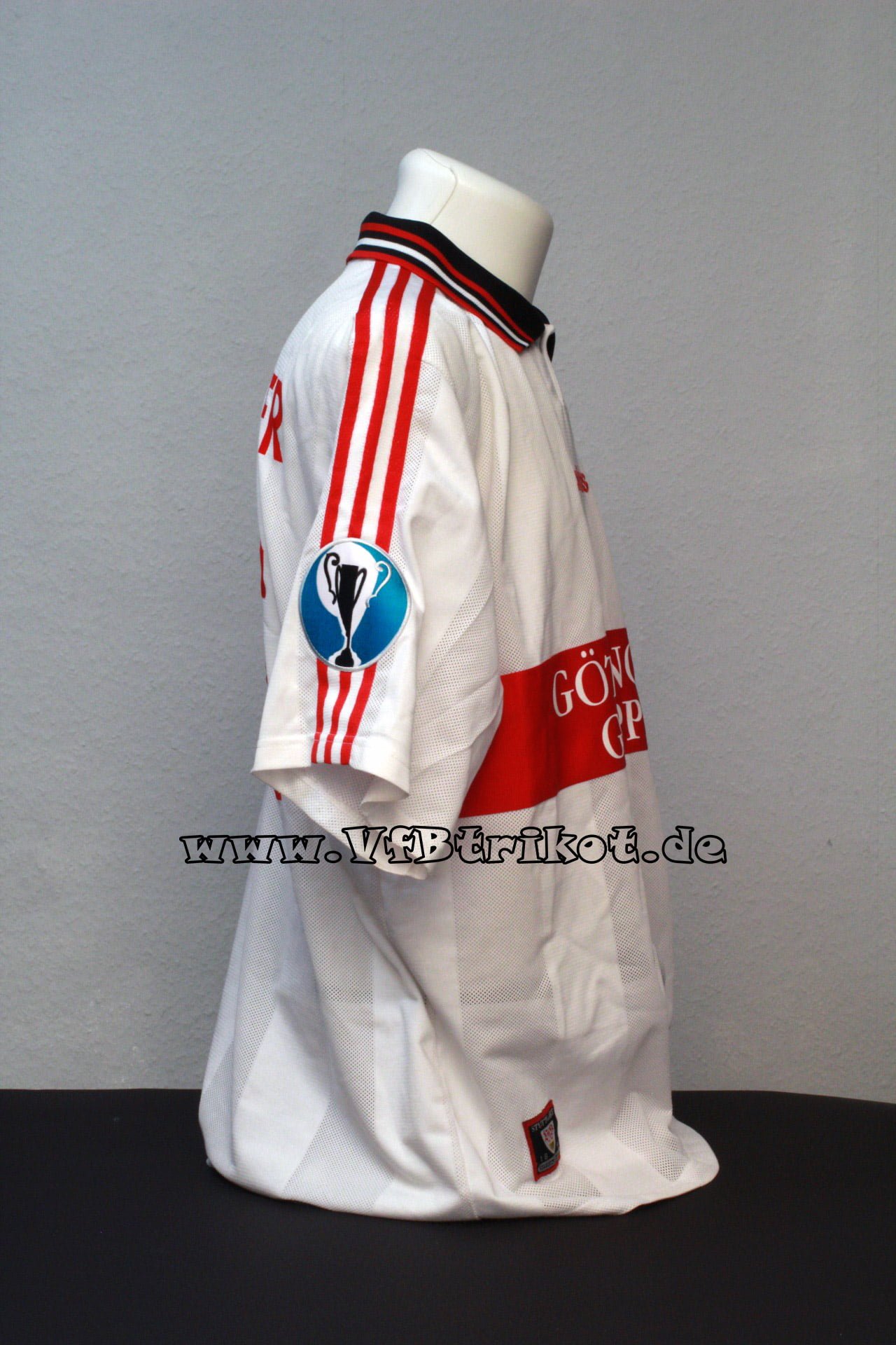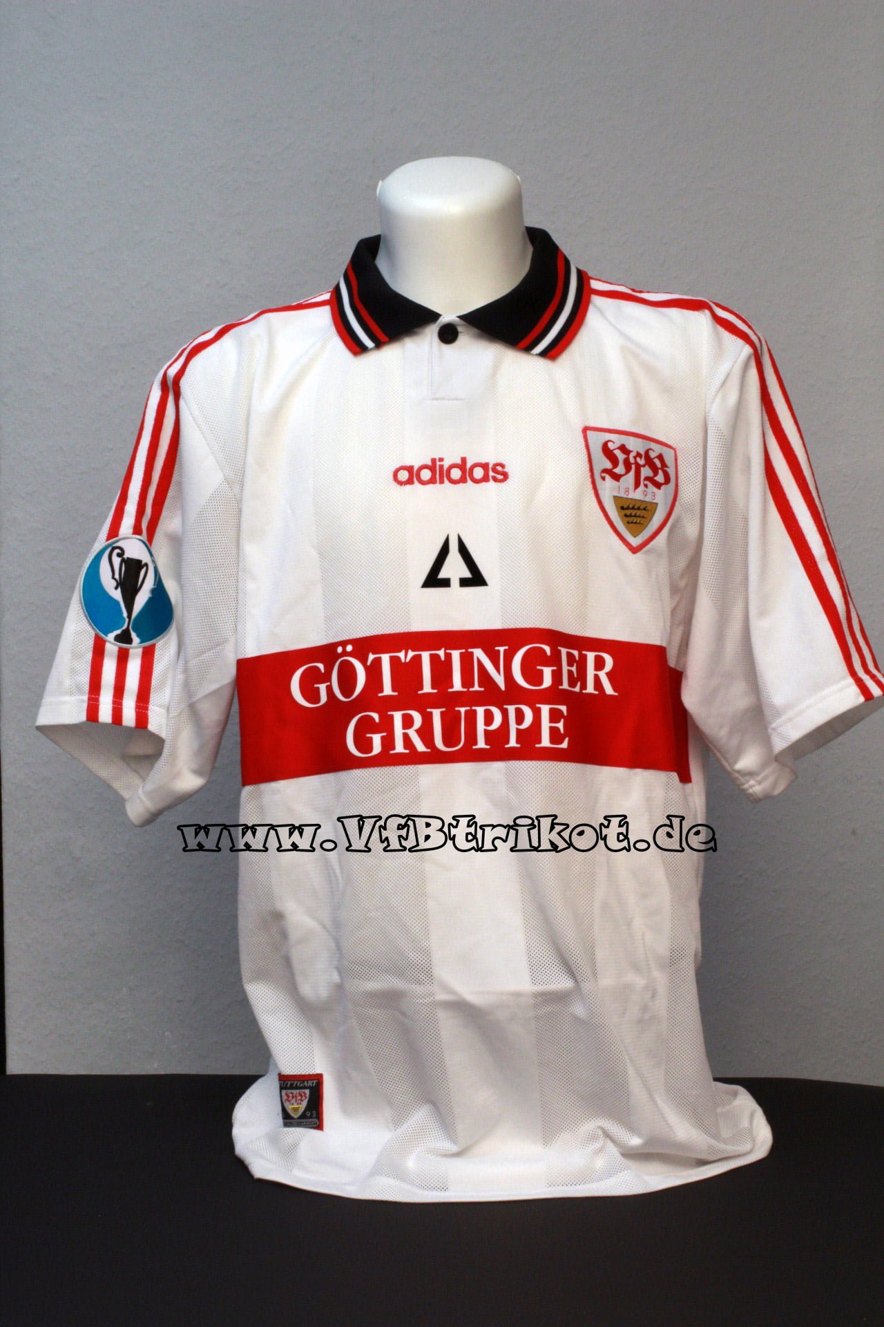 1997/98 - Gerhard Poschner - Europapokal der Pokalsieger Finale - weiß - kurzarm - mit diesem Patch wurde ausschließlich im Finale in Stockholm gegen den FC Chelsea gespielt. Außerdem ist sowohl der Schriftzug als auch das Logo vom Sponsor Göttinger Gruppe dünner und kleiner beflockt.
